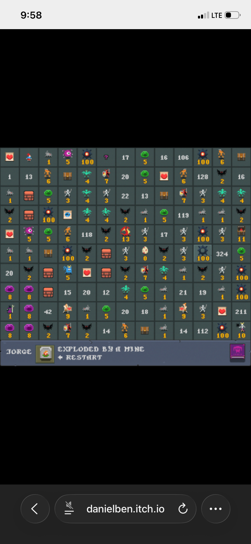 also, a tip to make it the slightest bit easier, if you happen to reveal an empty tile, maybe you could reveal all the other empty tiles surrounding it like REGULAR minesweeper. that was I can at LEAST acknowledge that i just suck instead of getting outright killed because i CAN'T FUCKING FIND THOSE HEART RESTORE SCROLLS