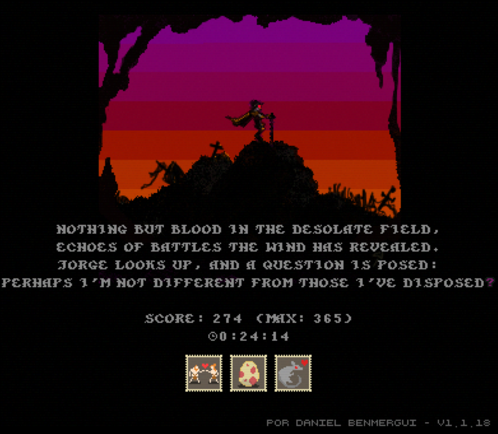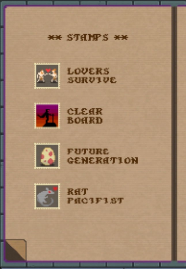 It took several dozen tries, but I finally managed to clear the game while sparing all rats, the lovers, and the dragon egg. I believe that's the most achievements you can earn in a single playthrough. Though I have to say, it bothers me a lot that after the first time you get a full clear, your ending is permanently corrupted. That gimmick works great for Undertale, since that game does everything in its power to steer you away from killing all the monsters. But it's completely out of place in a game like this, where a full clear is almost certainly the first challenge run any player will try.